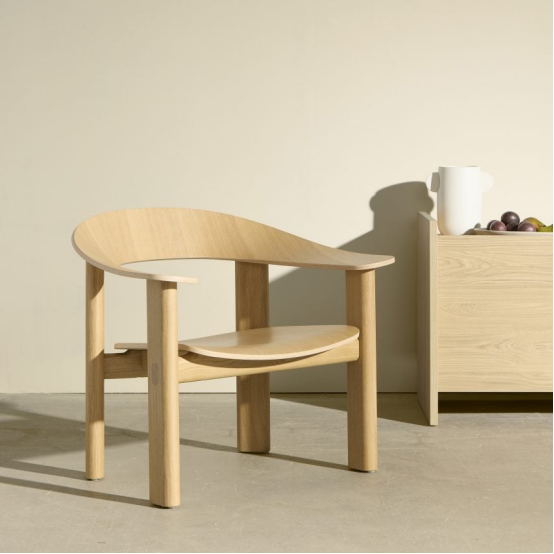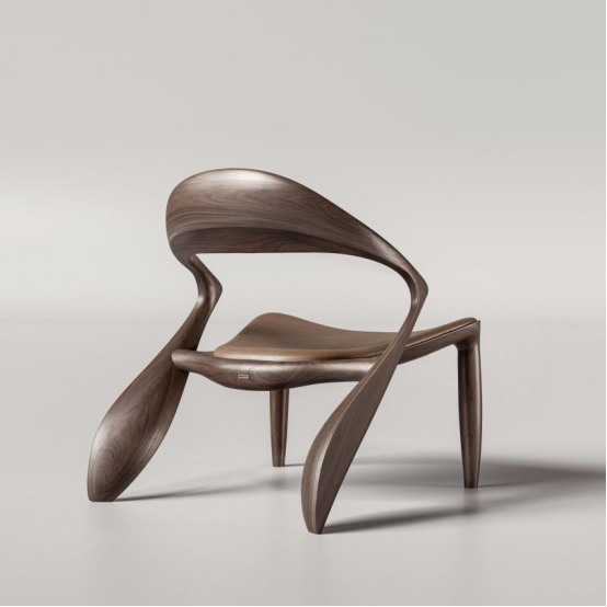垂直的前腿和流暢的弧形靠背構成了整體造型,椅身由動態雕刻的木材制成。
