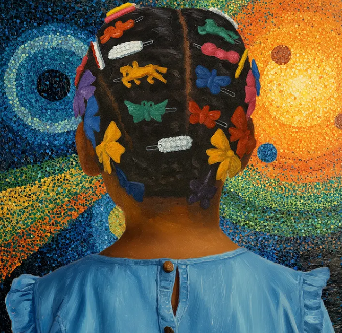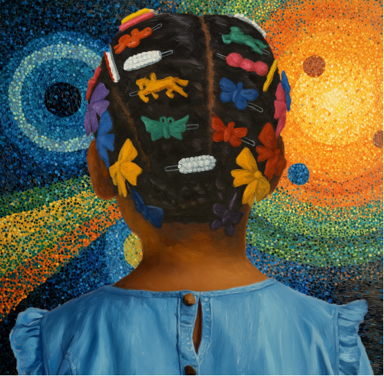 創(chuàng)作《發(fā)夾與宇宙》時(shí),我首先選取了一張黑人女孩的后視角照片,她發(fā)間別著若干彩色發(fā)夾。隨后將照片上傳至ChatGPT,要求模型根據(jù)我的構(gòu)思生成圖像。最終成果如下。