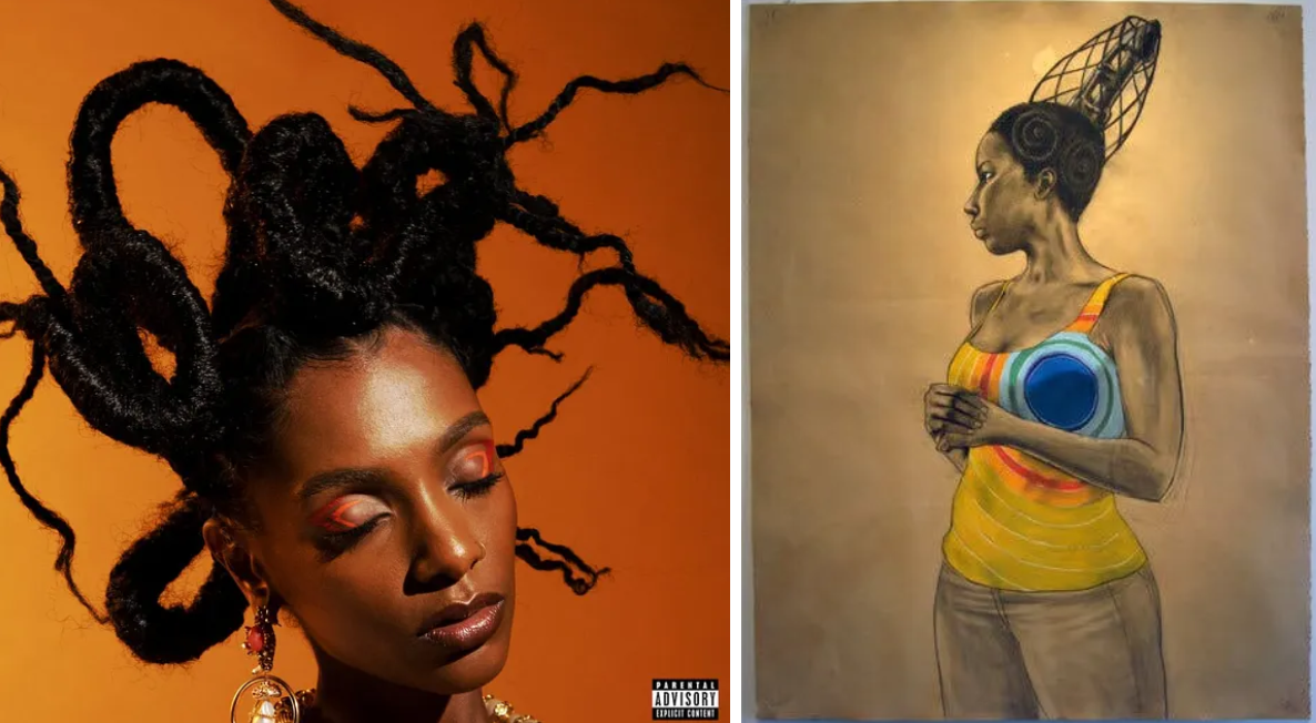 左圖:瑪麗安·梅雷巴《Rider》封面藝術(shù);右圖:羅伯特·普魯伊特(Robert Pruitt),《太陽(yáng)神》(Sun God),2011年。
