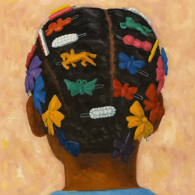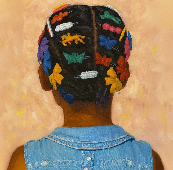 許多黑人女性都記得童年時(shí)發(fā)間點(diǎn)綴飾物的時(shí)光(如串珠、小飾物和發(fā)夾)。在谷歌搜索中輸入關(guān)鍵詞,立刻會(huì)呈現(xiàn)出一幅黑人女孩發(fā)間綴滿數(shù)十個(gè)彩色飾品的"織錦圖"。這些圖像來(lái)自提供編發(fā)服務(wù)的沙龍網(wǎng)站、造型教程頻道以及飾品銷售店鋪。這正是我們傳承數(shù)世紀(jì)之久的儀俗實(shí)踐,作為文化遺產(chǎn)的一部分,從往昔流傳至今,并將被珍視與守護(hù),延續(xù)至未來(lái)。