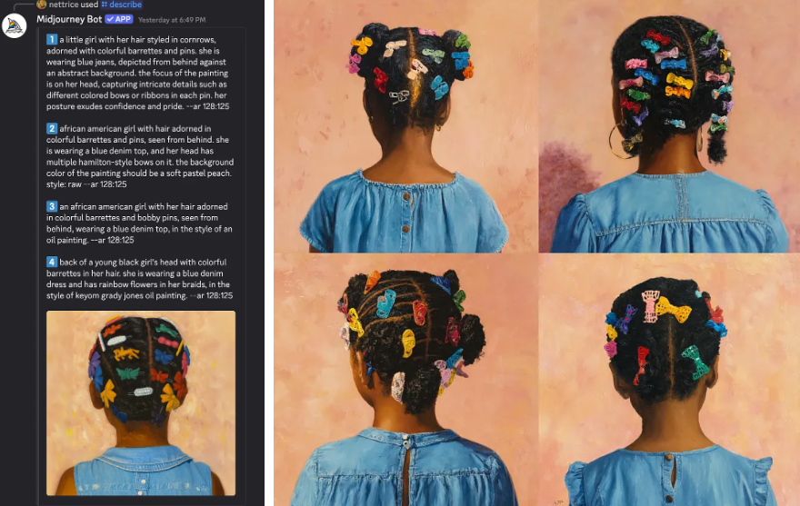根據(jù)研究人員的觀點(diǎn),心理學(xué)和身體意象研究長(zhǎng)期以來(lái)在很大程度上忽視了黑人/非裔美國(guó)女孩及其與頭發(fā)相關(guān)的經(jīng)歷,我們需要更多相關(guān)研究來(lái)深入理解頭發(fā)在年輕女孩成長(zhǎng)過(guò)程中所扮演的角色。我們——這里的“我們”也包括曾經(jīng)作為黑人女孩的我——常常經(jīng)歷頭發(fā)歧視與欺凌。我記得在芝加哥卡布里尼-格林小學(xué)教藝術(shù)課時(shí),一位黑人女學(xué)生問(wèn)我,為什么我選擇保留自然發(fā)型,而不是把頭發(fā)拉直。我告訴她,這是上天賜予我的樣子。無(wú)論是當(dāng)時(shí)還是現(xiàn)在,我都看到黑人的頭發(fā)與身份認(rèn)同發(fā)展之間存在著積極的關(guān)聯(lián)。我相信,借助生成式人工智能,這種關(guān)聯(lián)可以得到進(jìn)一步強(qiáng)化和頌揚(yáng)。