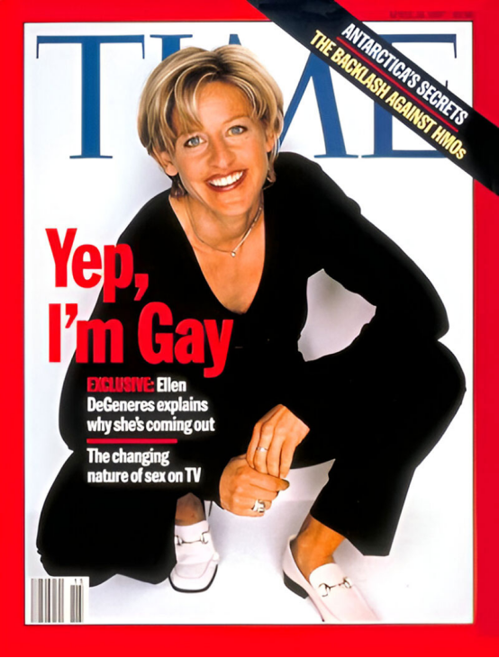 艾倫?德詹尼絲成為首位在主流雜志封面上公開承認自己同性戀身份的黃金時段電視明星。這一具有里程碑意義的雜志期號,與她主演的美國廣播公司(ABC)情景喜劇《艾倫》中角色 “出柜” 的劇集同步推出。