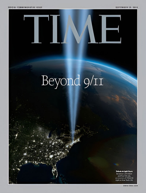 《時代》雜志用銀色邊框取代傳統紅色邊框,紀念 “9?11” 事件十周年。金屬質感的邊框象征著緬懷與反思,而非即時的悲痛情緒。