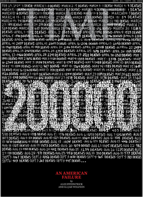 這是《時代》雜志史上第二次采用黑色邊框設計,以此紀念新冠疫情中的逝者。封面以手寫形式記錄了 2020 年 2 月 29 日至 9 月 8 日期間每天的死亡人數,形成了一條極具沖擊力的紀念時間軸。