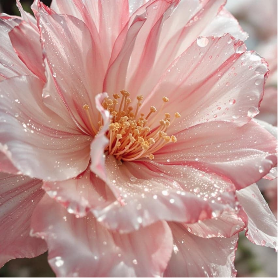 intricate close up of a 3D rendered flower made of glass, delicate petals and droplets, Japanese art influence, serene setting, soft natural lighting, muted color palette, subtle textures, elegant composition, peaceful mood, detailed stamen, dew drops, high resolution.
