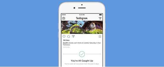 Instagram(2018年)在引入算法前,會讓你一直滾動直到看到帶有綠色對勾的“你已看完所有新動態(tài)”的消息