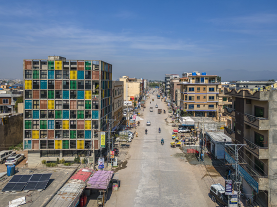 DB工作室是這座位于伊斯蘭堡的色彩繽紛的多層辦公設施的幕后設計者,該設施容納了一家旨在通過職業培訓賦能弱勢青年的慈善機構。該設計的決定性特征——其立面——給評審團留下了深刻印象:“這座新建筑的建筑表現力來自于其混凝土屏風,它矗立在兩個臨街立面前。這個應用的網格高9個方格,長10個方格,既保護了內部空間,又向城市展示了這座當代建筑。它通過重新詮釋熟悉而歷史的jaalis(鏤空屏風)和金屬屏風來實現這一點,這些屏風既有各種幾何圖案,也有不同的顏色。這種結合歷史詮釋以提供一個視覺受控 yet 令人愉悅的立面,使該建筑具有易于識別和獨特的表面。”