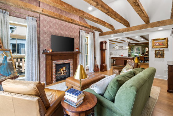 在這座由 Richard Taylor Architects 翻新的俄亥俄州哥倫布市歷史住宅中,客廳采用了豐富的木材和棕色構(gòu)成的溫暖色調(diào),配以柔和的綠色沙發(fā)、淺酒紅色墻紙和灰藍色點綴。