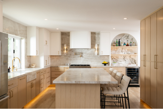 這間由 OC Builders Group 設(shè)計的加州橙縣廚房,通過淺色木材、天然石材、拱形門道、曲線型抽油煙機和布藝覆蓋的吧凳展示了有機現(xiàn)代風格。