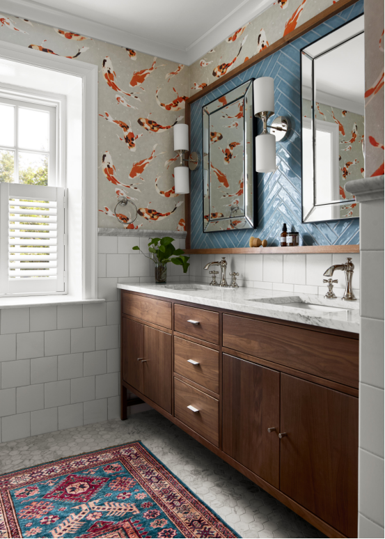 受他們此前在香港住所的啟發(fā),這對費城夫婦的浴室由 Airy Kitchens 設(shè)計,采用了藍色人字形瓷磚來喚起水的意象,并配以錦鯉壁紙增添趣味。