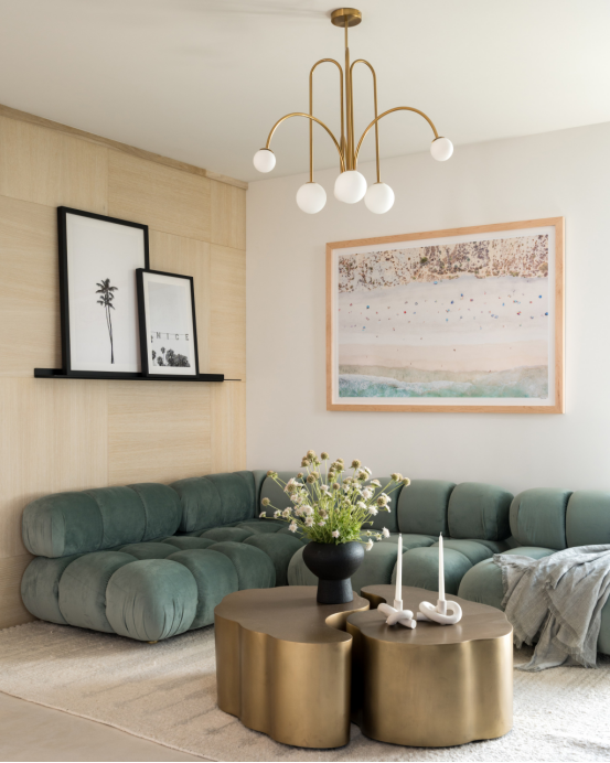 在這間由 Erin Anderson Interiors 設(shè)計的圣地亞哥客廳中,一個球根狀組合沙發(fā)以及雕塑感的黃銅咖啡桌和燈具創(chuàng)造了一種柔和、誘人的外觀。