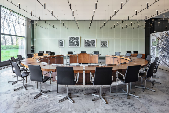 在哥本哈根的蒙克加德學校(1957年),他平衡了建筑與景觀,將庭院和花園編織進學習環境中。在牛津大學圣凱瑟琳學院(1964年),他的第一個海外重大項目,他創建了一個現代主義校園,其中建筑、家具、紡織品和種植形成了一個無縫的整體。最后,哥本哈根的丹麥國家銀行(1961–71年)在宏大的市政尺度上展現了同樣的嚴謹,具有精致的比例和一絲不茍的細節。他的方法始終模糊了建筑、室內與自然之間的界限。