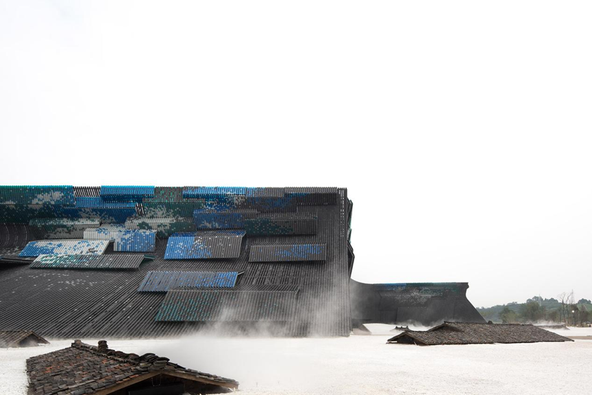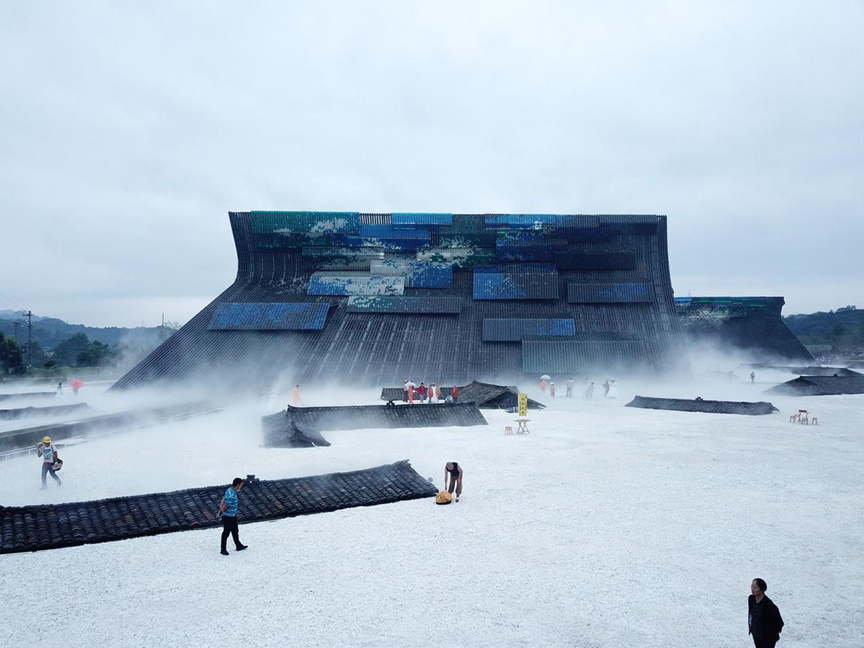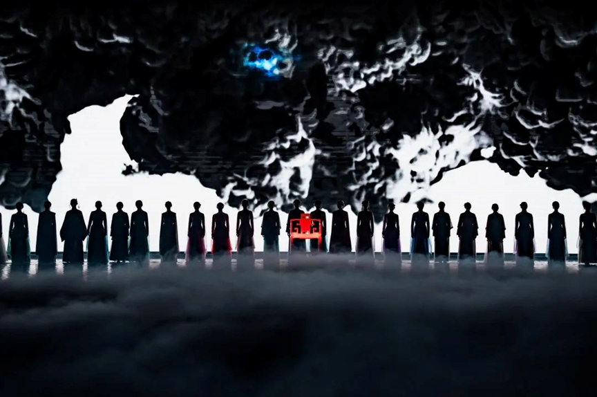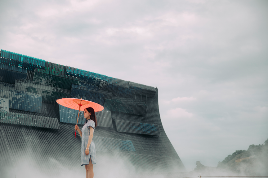 室外的“云之中”,是園林景觀劇場,由白色礫石和8000㎡霧森系統營造云海氛圍,屋頂在云霧中若隱若現,讓觀眾仿佛置身人間仙境。?