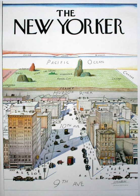 索爾·斯坦伯格的插圖以夸張的地理視角詮釋曼哈頓中心主義,成為雜志史上被復制最多的封面,確立了城市地方主義的視覺速記符號。