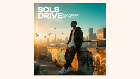 '嘻哈;自信、陽光充沛、電影感酷炫(流派與情緒)+?金色時刻寫實城市屋頂;涂鴉覆蓋的護墻;鴿子騰飛;一個穿著街頭服飾的時尚身影倚靠在金屬欄桿上,處于情緒化的陰影中(主體/場景)+?寫實電影靜幀;基于物理的渲染;超細致;觸感材質(老化的磚塊、噴漆紋理、磨損的金屬、真實的皮膚和織物)(藝術風格/媒介)+?溫暖的金琥珀色和蜂蜜色高光,與石墨陰影平衡; subtle teal天空和藍色調(調色板)+?;低3/4角度,眼平線;三分法主體放置;城市天際線背景;淺景深(Depth of Field) 35–50mm效果;為文字留出充足的負空間天空(構圖/視角)+?變形鏡頭太陽耀斑;漂浮的塵埃微粒;輕柔的膠片顆粒;鴿子上的輕微運動模糊;勵志的城市敘事/主題(特殊效果/主題)+?文字:“SOLSTICE DRIVE”作為大標題位于左上角;“CONCRETE SKIES”對齊在旁邊較小; condensed techno-humanist grotesque字體,大寫,緊密字距 (+10–20),白色效果,清晰字間距,無陰影(文字元素)。'