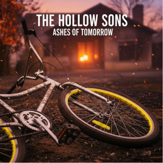 '另類搖滾;憂郁、親密、電影感(流派與情緒)+?特寫一輛倒在覆蓋著灰燼的郊區(qū)庭院中的青少年自行車;后方是柔和發(fā)光的燒毀房屋(主體/場景)+?寫實宏觀電影靜幀;PBR(基于物理的渲染);高微觀細節(jié)(灰燼、鏈條油污、起泡的油漆)(藝術風格/媒介) + 金色高光 vs. 石墨陰影;啞光鉻色(調色板)+?超低、偏離中心的構圖;自行車主導前景;50mm變形鏡頭散景;為文字留出負空間(構圖/視角)+?漂浮的灰燼顆粒、熱霾、淡淡的煙霧;自然顆粒感(特殊效果/主題)+?文字:“THE HOLLOW SONS”大標題位于中上方;“ASHES OF TOMORROW”位于標題下方較小; condensed grotesque字體,大寫,緊密字距,白色,清晰字間距(文字元素)。'