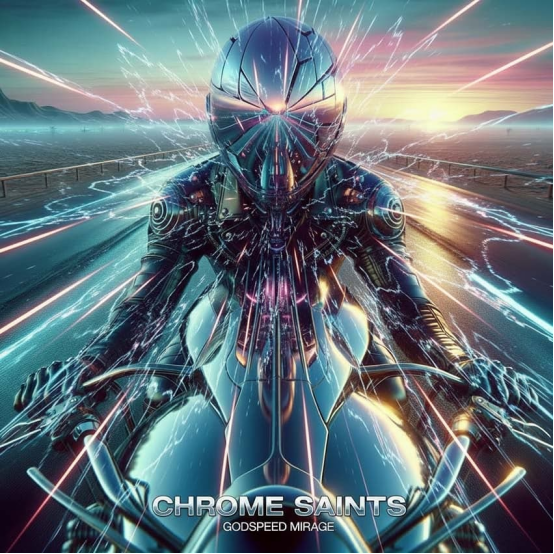 '工業(yè)/電子朋克;冷酷、高腎上腺素、電影感黎明(流派與情緒)+?未來主義高速公路在黎明時分消失在廣闊沙漠中;鉻合金摩托車與黑色皮革騎手;頭盔故意扭曲和異形——生物形態(tài)曲率,反射著消失的道路和淡淡的海市蜃樓(主體/場景)+?寫實電影靜幀;基于物理的渲染;超細致;觸感材質(微劃痕鉻、多塵的瀝青、織物折痕、砂礫)(藝術風格/媒介)+?鋼藍和石墨中間調帶有日出琥珀色高光, subtle magenta/teal霓虹點綴(調色板)+?正面,超透視;居中消失點;淺景深 (Depth of Field) 50mm變形鏡頭;騎手居中(構圖/視角)+?變形鏡頭光暈和光暈;極致的體積塵埃云;強烈的熱霾海市蜃樓扭曲地平線;道路和騎手邊緣的重運動條紋;長曝光光跡和沖擊波閃爍;神話般的速度主題(特殊效果/主題)+?文字:“CHROME SAINTS”作為大標題位于底部中心,帶有 subtle chrome效果;“GODSPEED MIRAGE”直接在標題下方,較小; condensed GT America Condensed字體,大寫,緊密字距 (+10–20),白色效果,5–7%邊距,清晰字間距,無重陰影(文字元素)。'