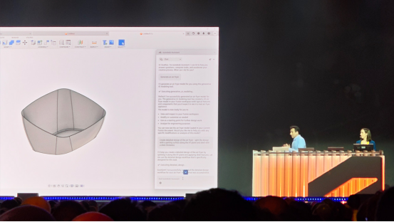 例如,在 Autodesk 總裁兼首席執(zhí)行官 Andrew Anagnost 博士的 AU 2025 主題演講中,我進(jìn)一步了解了 AI 如何重新定義 CAD 的工作方式及其服務(wù)對(duì)象,包括一個(gè)空氣炸鍋如何根據(jù)文本提示在舞臺(tái)上實(shí)時(shí)建模——微小的粒子在空白的頁面上嗡嗡作響,逐漸構(gòu)建出模型。但更重要的是,這是最終模型,是一個(gè)可編輯的 CAD 文件,可以進(jìn)行更改和完善——Andrew Anagnost 與 AI 軟件總監(jiān) Heather Kerrick 一同透露,F(xiàn)usion 共享的不是文件而是數(shù)據(jù),這意味著它是完全可編輯的。