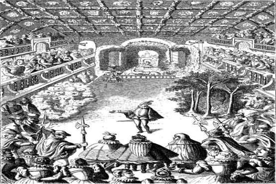 亨利三世及其宮廷在盧浮宮畫廊觀看芭蕾表演的描繪。圖片 via Wikimedia,公共領域