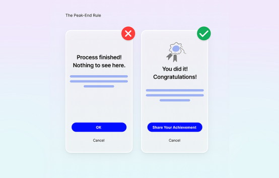 通過(guò)優(yōu)化峰值時(shí)刻和最終步驟,例如新手引導(dǎo)、錯(cuò)誤處理、結(jié)算流程和游戲化獎(jiǎng)勵(lì),界面可以給用戶留下積極的記憶,即使體驗(yàn)的某些部分不那么出色。
