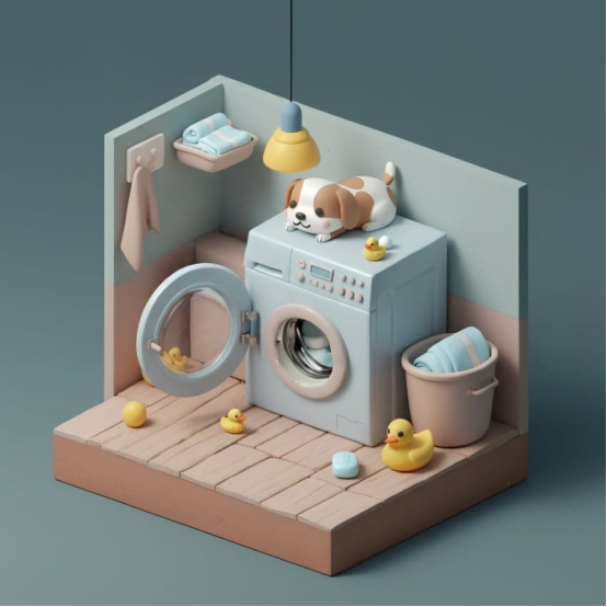 提示詞:"一個可愛的迷你場景模型,包含一臺洗衣機,一只狗躺在上面。狗旁邊有一些小配件,如一塊肥皂和橡皮鴨。背景簡單,場景由粘土材料制成,采用pastel配色方案。圖像是3D渲染,帶有工作室燈光和等距視圖,使用Blender創建。"(注意:此提示詞與上一個重復,可能原文有誤。扁平風提示詞應描述扁平、非3D風格)
