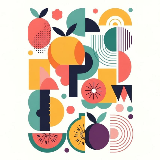 提示詞:"各種水果的幾何插圖;扁平設計,極簡海報藝術,帶有幾何抽象、大膽的圖形圖案和整合的排版,簡化的形態和簡單的形狀;在純白背景上的無縫、延伸到邊緣、無邊框圖案,帶有散落的小圓形陰影;干凈的矢量風格渲染,線條清晰,填充均勻;色彩鮮艷的基本形狀和線條嚴格限制在四色方案內(紅、黑、綠、黃),高對比度;超清晰,印刷就緒,高分辨率。"