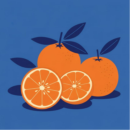 提示詞:"一個可愛的極簡主義橘子插圖,排列在藍色背景上;受剪貼畫啟發的扁平設計,線條清晰,大膽的幾何形狀,鮮艷的色彩,以及俏皮、異想天開的卡通感;居中的整顆和切片橘子簇,帶有幾片葉子,大量留白,平衡的布局以傳達簡約和極簡主義;平坦、均勻的渲染,極少或沒有陰影;邊緣清晰;僅在需要區分形態時使用細微的投影;充滿活力的橘子與濃郁的藍色背景形成對比,帶有暖色點綴;有限的、高對比度的調色板;純色填充;無紋理;印刷和網頁就緒,易于編輯(矢量友好/分層),高分辨率輸出。"