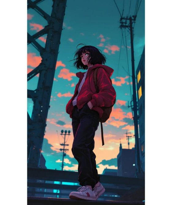 提示詞:"一個復古動漫女孩,深色頭發,穿著紅色夾克和黑色褲子,背著一個背包;采用80-90年代動漫美學,清晰的賽璐璐著色,細線條,和細微的膠片顆粒感;構圖為一個動態、有力的在鋼梁上邁步的四分之三視角,凝視著遠方的城市天際線;在黃昏/藍色時刻照明,帶有柔和的環境邊緣光、城市燈光散景、輕微的泛光和大氣霧霾;使用帶有藍色高光和綠色色調的pastel調色板,紅色作為大膽點綴,詳細的角色設計,和風吹亂的頭發;渲染為超精致、高分辨率的插圖。"