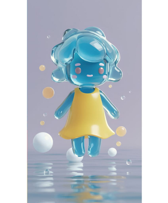 提示詞:"一個全身的、適合做壁紙的3D渲染圖,一個由柔和模糊的嬰兒藍透明塑料制成的可愛卡通人形角色,穿著黃色連衣裙;簡單的皮克斯風格Cinema 4D風格,帶有可愛、少女的美學和富有表現力的面孔;居中構圖,背景為淡紫色,淹沒在海洋中,漂浮著白色球體和黃色抽象形狀;自然的水下焦散,柔和的全局照明,干凈的反射和半透明效果;明亮但低飽和度的色調,以嬰兒藍為主導方案,帶有黃/白點綴,超級詳細的材質和細微的氣泡;超高清,工作室級質量。"