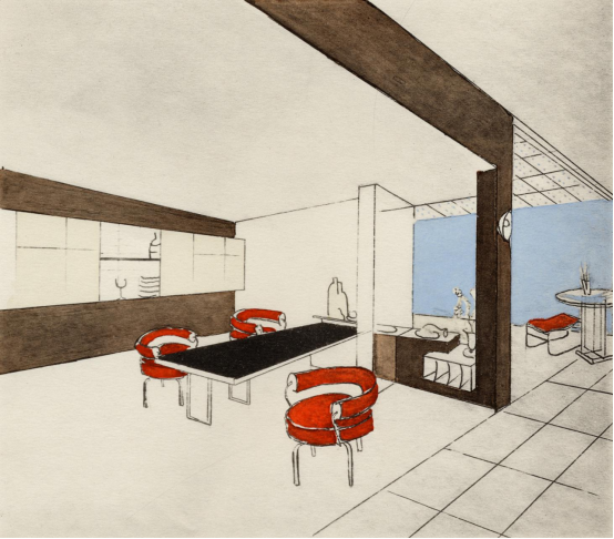 夏洛特·佩里安,巴黎圣敘爾比斯廣場公寓工作室餐廳透視圖,1928年