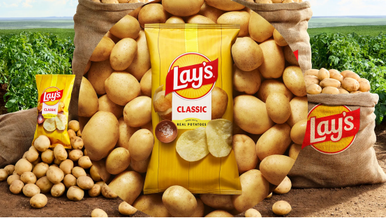 在商店貨架上,土豆是王道,因為樂事現在在每種口味的包裝上都突出了土豆的圖像。這些土豆的形象也因口味而異,強調產品背后不同的天然形狀、切片和去皮技術。
