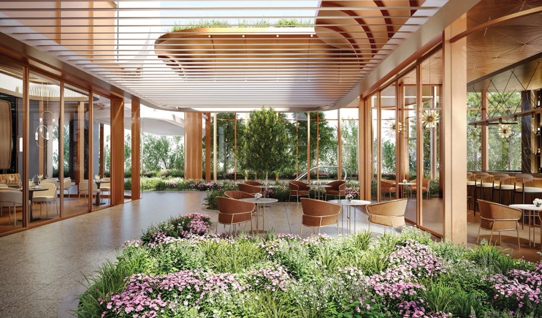頂部采用了環形元素,這個設計不僅是美學的體現,也體現了該項目在建筑創新和細節雕琢上的獨特追求,成為 The Skywaters 不可忽視的視覺焦點。