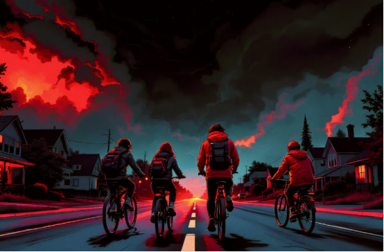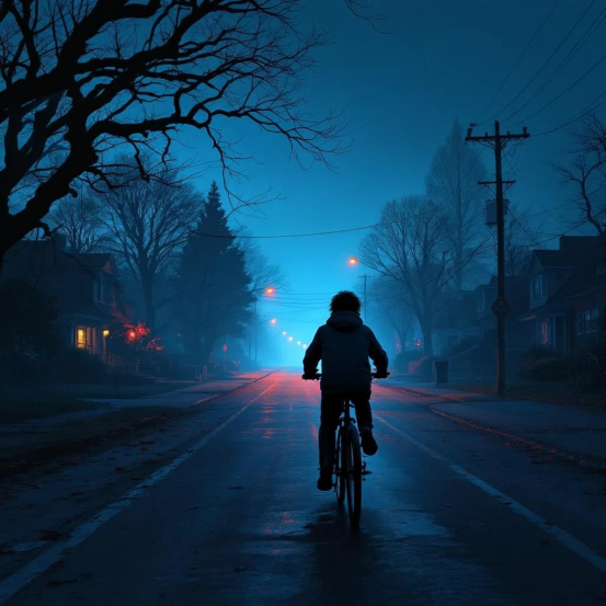 "一個青少年夜晚騎著自行車穿過霧氣彌漫的郊區(qū)街道。場景感覺懸疑而安靜,以1980年代電影恐怖片的風(fēng)格捕捉,帶有深藍(lán)色和紅色的調(diào)色板。"