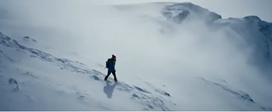 "一個孤獨(dú)的徒步者在被雪覆蓋的山上的全景航拍鏡頭,在暴風(fēng)雪中穩(wěn)步移動,以憂郁的電影風(fēng)格拍攝,配有緩慢的環(huán)境鋼琴配樂。"