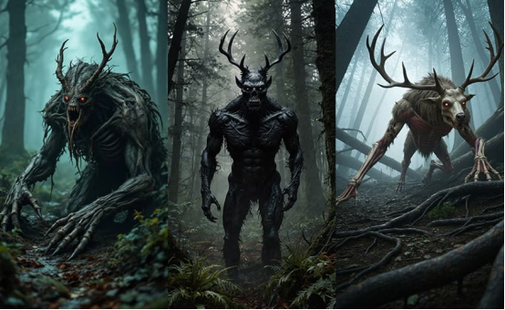 "一個可怕的森林生物在霧氣彌漫的森林中緩慢行走,黑暗而不祥的氣氛,霧蒙蒙的月夜,鏡頭推近,風(fēng)穿過樹林沙沙作響。"
