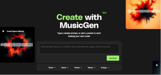 如果你想捕捉那種詭異、合成器音色重的感覺,像MusicGen這樣的工具可以幫助你快速實(shí)現(xiàn)。無需翻遍音效庫或從頭開始作曲,你可以描述你想要的氛圍(例如"緩慢的80年代合成器,黑暗且極簡,恐怖色調(diào)")并生成適合的音樂。嘗試試驗(yàn)不同的提示詞組合: