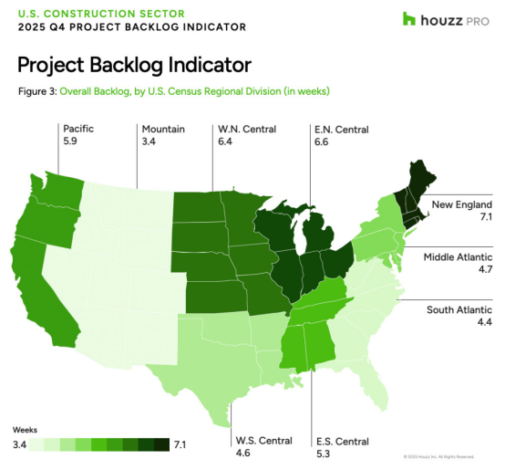 從地理上看,建筑行業的項目積壓時間差異顯著,從山區各州(包括亞利桑那州、新墨西哥州、懷俄明州、內華達州、科羅拉多州、猶他州、愛達荷州和蒙大拿州)的3.4周到新英格蘭地區各州(包括緬因州、馬薩諸塞州、康涅狄格州、新罕布什爾州、羅德島州和佛蒙特州)的7.1周不等。