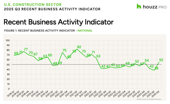 根據《2025年第四季度Houzz美國裝修晴雨表》報告,在第三季度業務活動強勁反彈之后,建筑專業人士對2025年最后一個季度重拾樂觀態度。與此同時,盡管業務略有放緩,建筑和設計服務領域的企業仍保持謹慎樂觀。