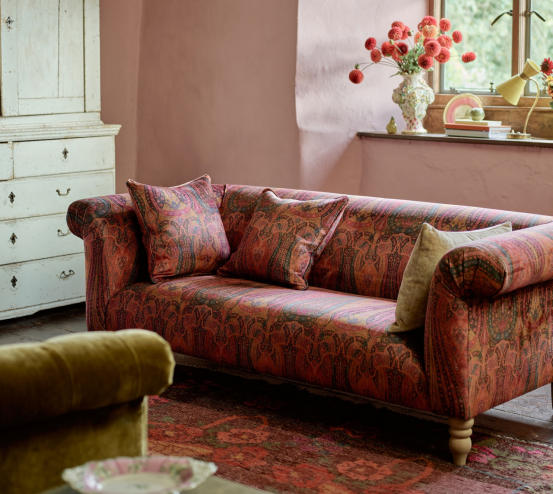 沙發:Exbury,V&A "印度錦繡"系列奢華絲絨,佩斯利華麗紅圖案,Sofas & Stuff公司