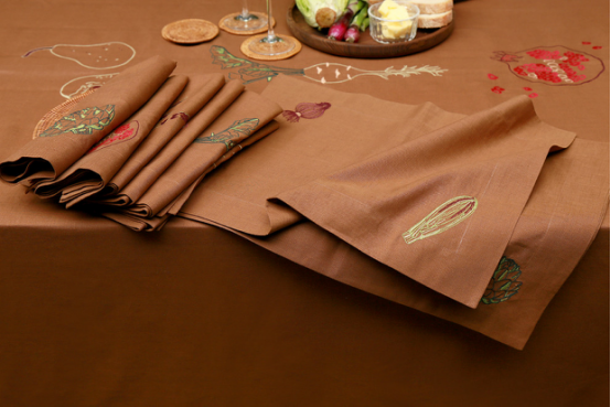 Reed Family Linen的這款餐桌布藝上的果蔬圖案靈感源自古老的園藝平版畫。該亞麻布藝也有白色和灰褐色可選,但這種濃郁的棕色臘犬色完美地展現了刺繡細節。