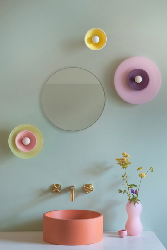 定制照明公司Curiousa展示了多款為浴室設計的甜美 pastel 色燈飾,包括這些陶瓷和手工吹制玻璃壁燈。