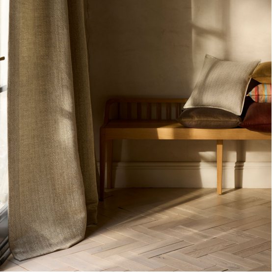 例如,Ian Mankin的這款提花編織窗簾面料,頌揚了手工鋪設的茅草或散落的浮木的不完美之美,營造出寧靜而引人遐想的氛圍。