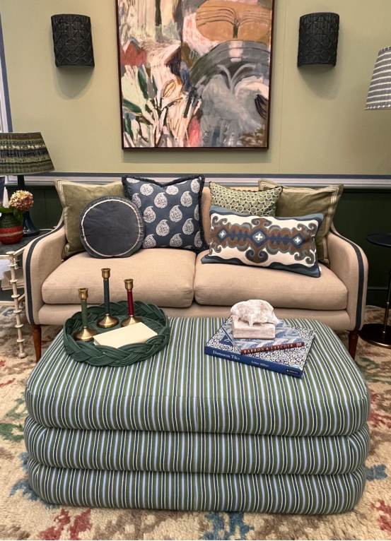 Birdie Fortescue的展位上充滿了層層疊疊的曲線,展示了許多靈感來自Fortescue穿越亞洲及其他地區旅行的設計。這款藍綠條紋的Sorgue腳凳是完美的軟座或咖啡桌,鉸鏈式蓋子下還設有方便的儲物空間。