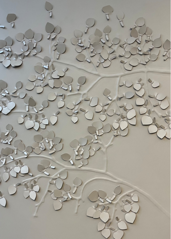 受樹葉和花瓣的韻律與重復啟發,紡織藝術家Louise Heighes使用皮革將花卉和枝葉的柔軟質感以裝飾板的形式帶入室內,這些裝飾板可作為藝術品或屏風。
