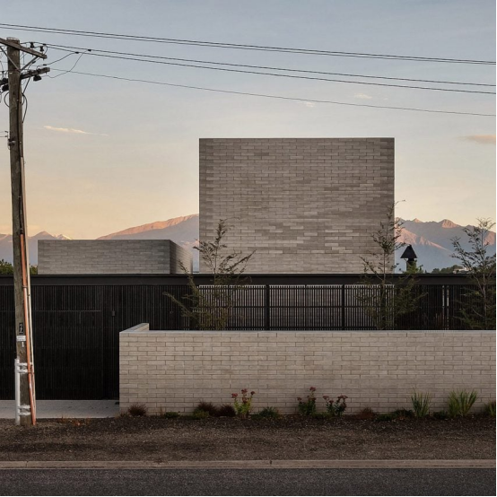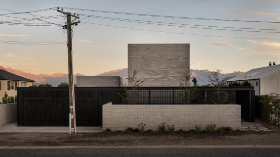 暴露的砌塊結構,以及由輕質鋼材和炭化木材制成的屏風,共同構成了位于新西蘭瓦納卡的SKI住宅的塊狀外立面,該住宅沒有面向街道的窗戶。