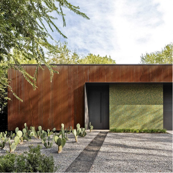 建筑師Scott Specht在奧斯汀為自己設計的附屬住宅單元旨在營造一種內向感,其外圍是無窗的耐候鋼立面,隱藏了內部設有高大玻璃窗的空間,這些玻璃窗朝向中央庭院。