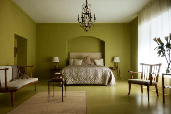這種令人愉悅的色彩非常適合廚房,與溫暖的木色調相得益彰。它在客廳或辦公室中也表現良好,能營造出一種柔和而充滿活力的氛圍。用有質感的中性色和淺色木材來平衡它,或引入墨藍色、木炭色或陶土色作為點綴來增加對比。