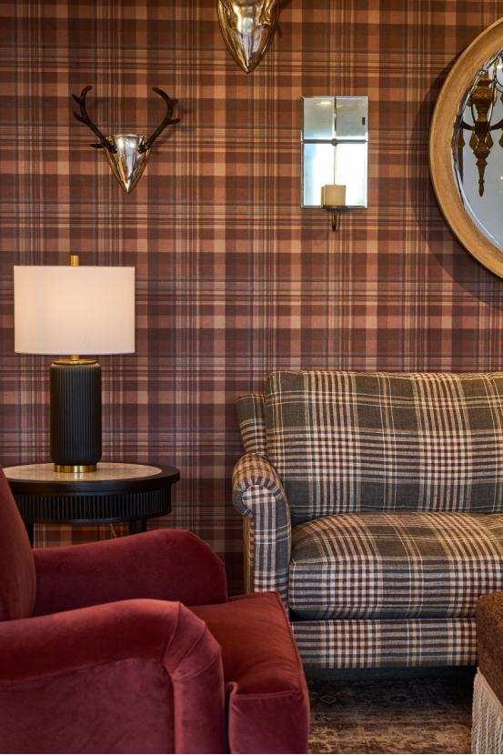 展望2026年,我們預計格紋將既作為點綴,也作為空間的主要圖案出現:在抱枕上、椅背上、墻紙上,甚至整個沙發上。圖中Fairfield的Flynn沙發置于滿墻格紋的背景前,正是對這一趨勢的加倍演繹。