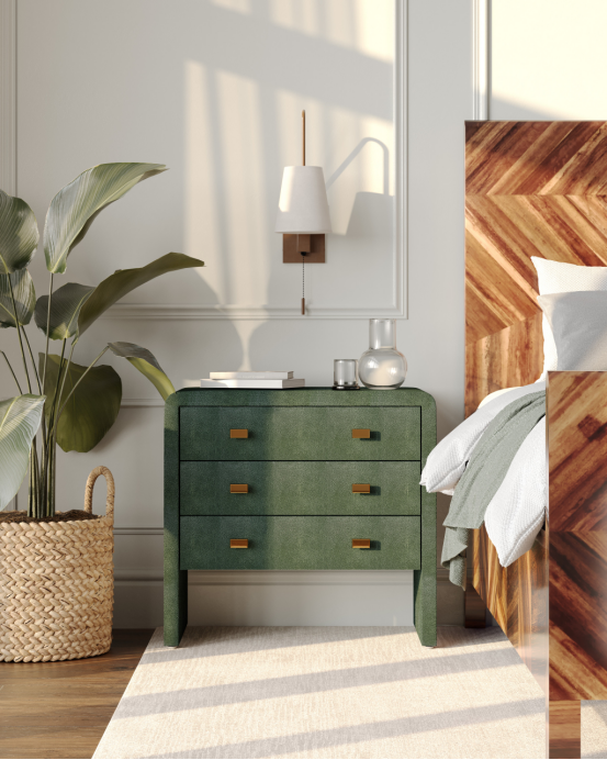 來自Made Goods的這款杜松綠色、仿鯊魚皮包裹的Dante衣柜就是一個漂亮的例子。