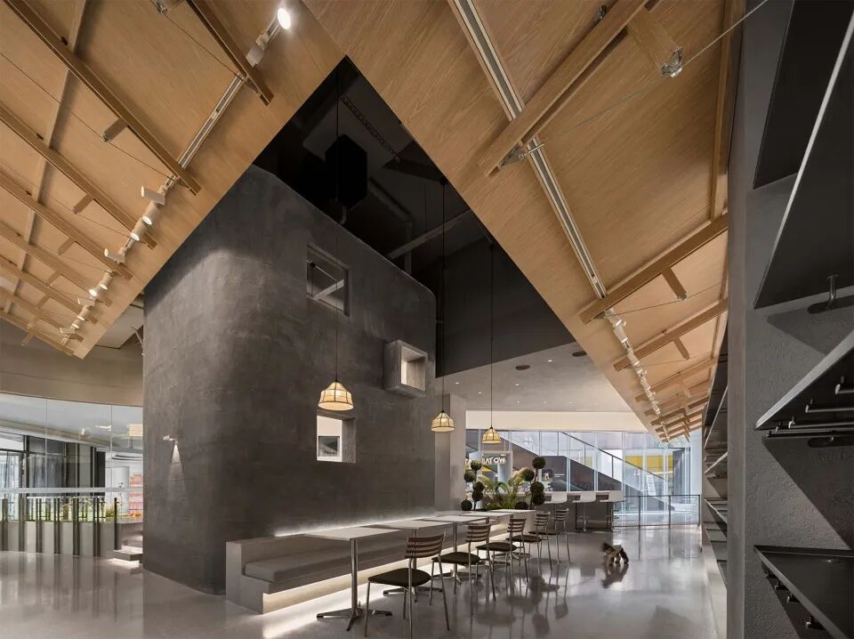 室內的動線圍繞核心筒展開,非零售區域整體抬高。這個高差使愛犬在抬高區而主人在非抬高區域時,視線高度會比以往更接近。高低區域組成的洄游動線為愛犬們提供了更具趣味的自由奔跑空間。